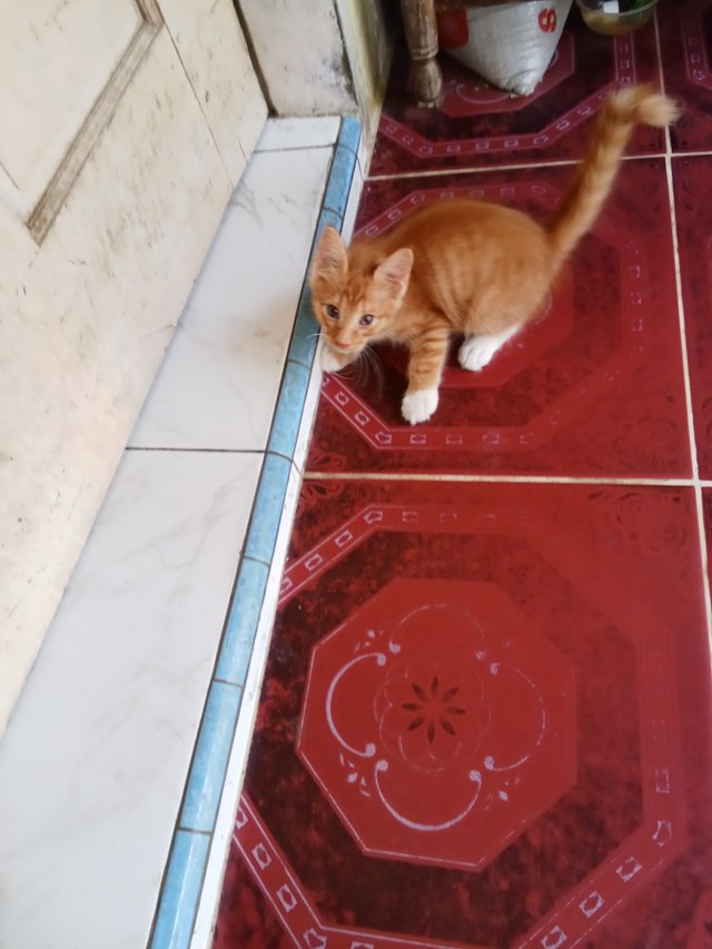 Kucing peliharaanku sedang asik bermain di teras rumah