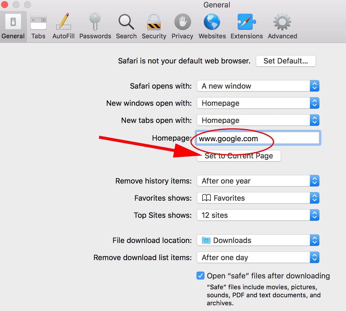 3. Where it says “Homepage:”, fill in the box with “www.google.com”. Then click the “Set to Current Page” button.