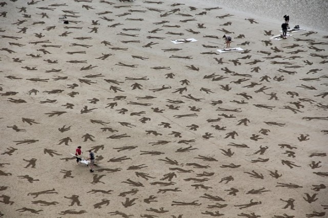 This establishment was a little away from the tide after a few hours. Stencil is used to attract more than 500 volunteers to draw figures on the beach.