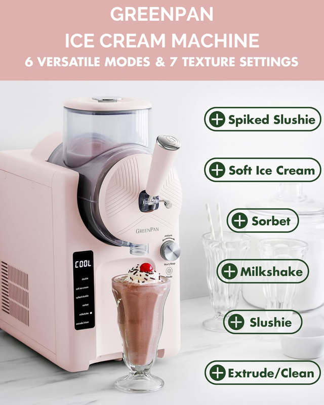 GreenPan Frost Ice Cream Machine & Frozen Drink Maker, Soft Serve, Slushie, Milkshakes & Cocktails, No Freezer Needed, 15-in-1, 7 Textures, Quiet & Rapid, Easy Clean, Family Size, Strawberry Pink.