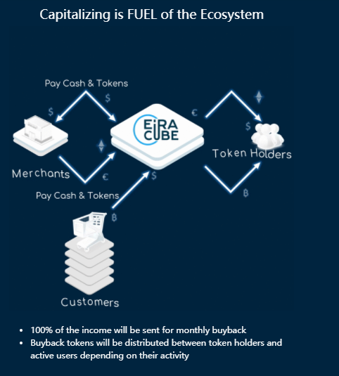 Capitalizing is the fuel of the system: full income will used to monthly buyback tokens and they will be