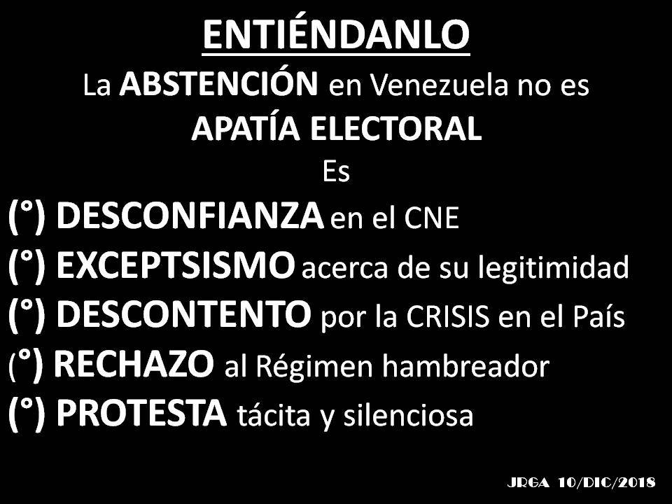 In any other part of the civilized world, abstention would be understood, as a rejection, or at least as a distrust, of a corrupt electoral system, here in Venezuela, the electoral body offers itself to support other nations with respect to this matter, They consider the best in the world.