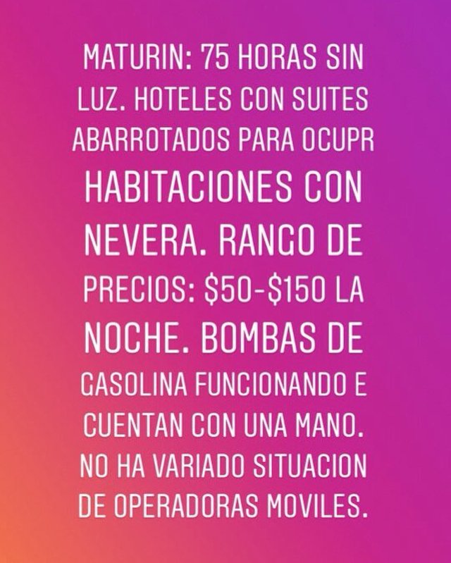 There are some cities (mainly Caracas) with power at a limited extent. Most tienes and cities remain the same: Fuel shortages, lacks of cash, no water. Hotels who normally charge about $20 a room for the night, now charge between $50-$150, just to let people use their fridge.
