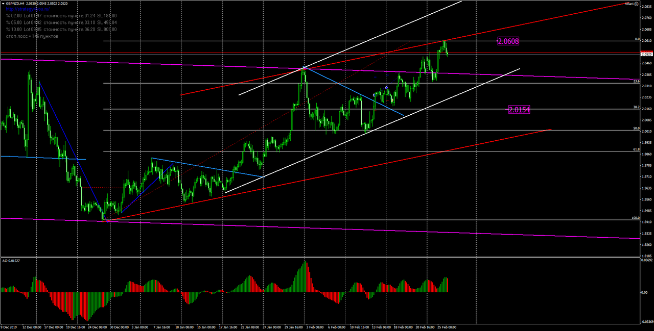 На этой неделе валютная пара британский фунт новозеландский доллар тестирует сверху линию поддержки нисходящую и начинает восстанавливаться. Цена отскакивает от линии сопротивления восходящего канала, сформировав максимум 2.0608. Пробой данного уровня и линии сопротивления восходящего канала это сигнал к продолжению восходящего тренда. А пока можно ждать коррекцию. Коррекция возможна к линии поддержки нисходящей + восходящего канала.