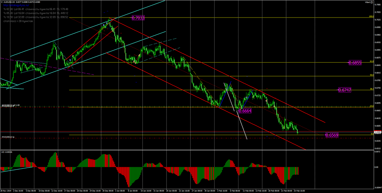 Пробой уровня 0.6630 дает нам точку входа в продажи. Открываем с текущих цен и тейк профит выставляем у уровня 0.6500.