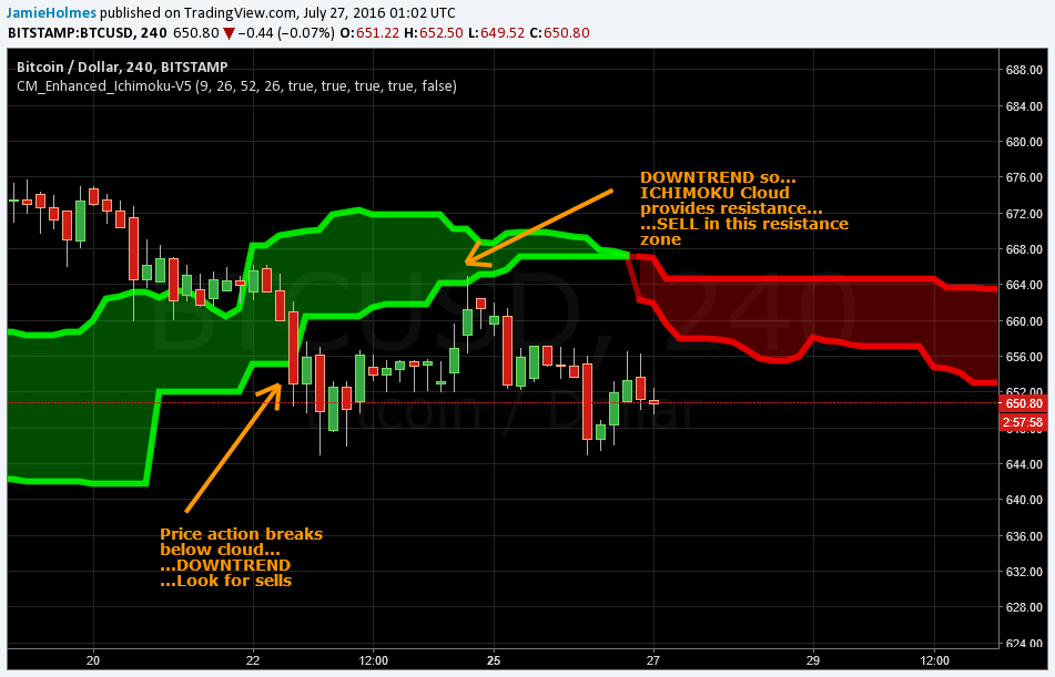 If the price is within the Kumo, the market is trendless. If the price is above the Kumo, then we have an uptrend whereas if the price is below the Kumo we have a downward trend. For example, the chart below shows the 4-hour price action for BTC-USD along with the Ichimoku cloud/Kumo. In this instance, we see that BTC-USD breaks above the Ichimoku cloud during the 12th July 2016, which is also known as a 'Kumo breakout'.