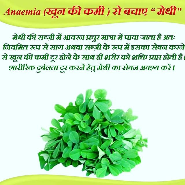 'Anaemia (खून की कमी) से बचाए 'मेथी" मेथी की सब्ज़ी में आयरन प्रचुर मात्रा में पाया जाता है अतः नियमित रूप से साग अथवा सब्ज़ी के रूप में इसका सेवन करने से खून की कमी दूर होने के साथ ही शरीर को शक्ति प्राप्न होती है शारीरिक दुर्बलता दूर करने हेतु मेथी का सेवन अवश्य करें|'.