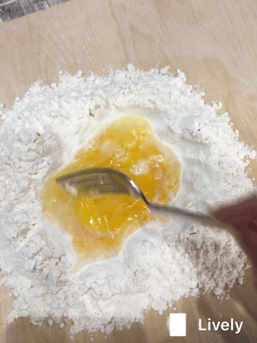 Sbattete leggermente le uova con una forchetta unendo un pò per volta la farina.