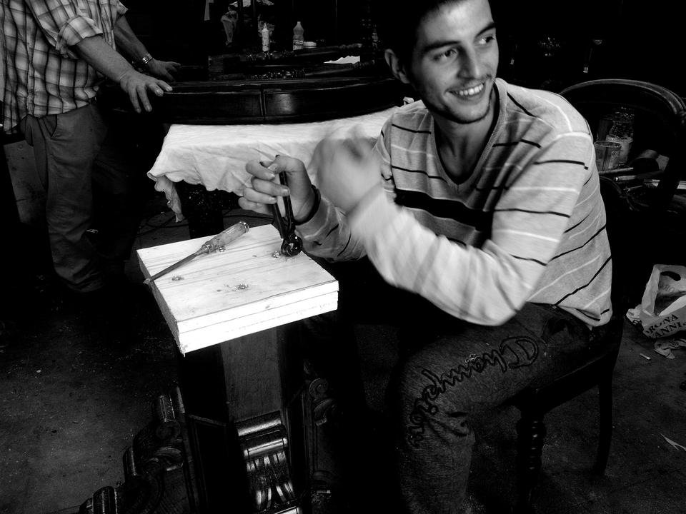 Camminando per le strade di Lecce, mi sono soffermato sull'uscio della porta di un restauratore. Con la scusa di chiedere qualche INFO ho cercato di fare due foto, ma non ai vari oggetti sparsi qua e la, ma bensì al giovane apprendista, il quale con simpatia e umiltà lavorava dignitosamente, senza lamentele ..Anzi, mentre cercava di fare non so che cosa, mi dava la quasi totale importanza come solo un esperto venditore saprebbe fare.. come la maggior parte di noi figli dell' Italia meridionale che lavoriamo con passione, precisione e ilarità.