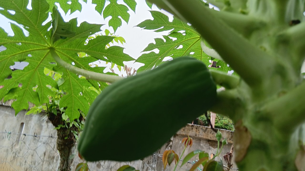 Today I took a photo of a papaya fruit in front of my house. It has the first fruit which is quite small.