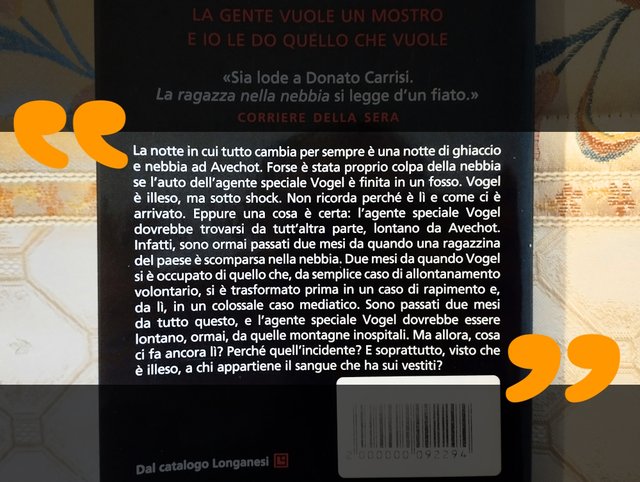 This new episode takes a cue from the Donato carrisi's novel, published with the title La Ragazza nella Nebbia (dated back to 2015 for the native version). It also exists as English version, titled The Girl in the Fog, that dates back to 2017. In the image below, you can see a cover picture from which I removed a few parts, trying to avoid possible direct advertisings.