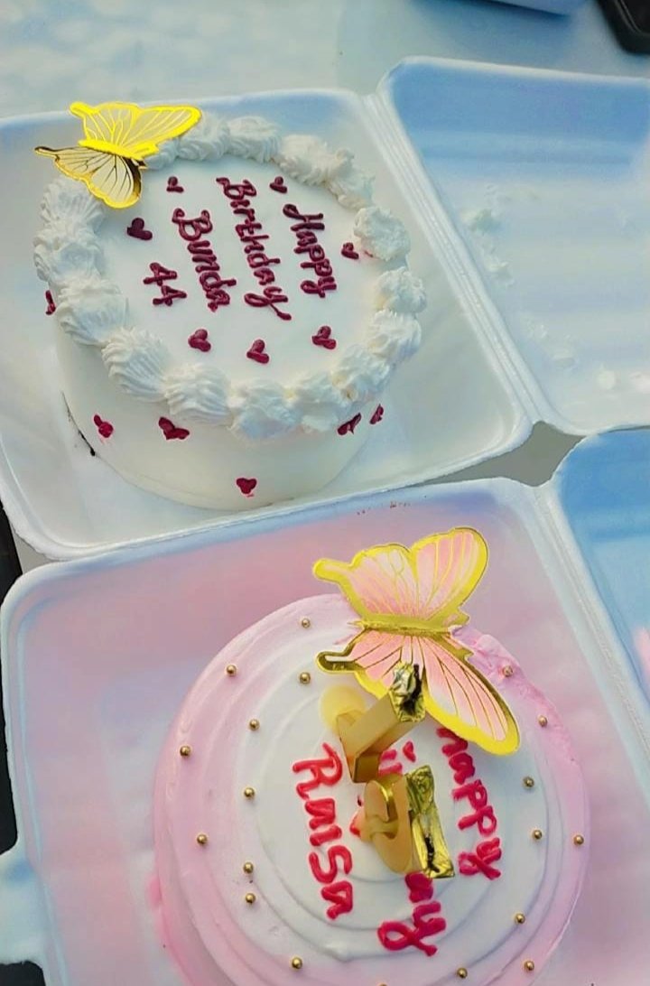 This sponge cake is a gift from a child to his mother, whose birthday is today. It's a special gift from a child to his mother. The white sponge cake symbolizes purity and love and peace. The second is a sponge cake with a butterfly theme on top; it looks truly beautiful, friends.