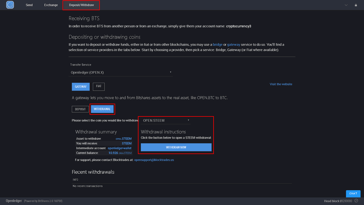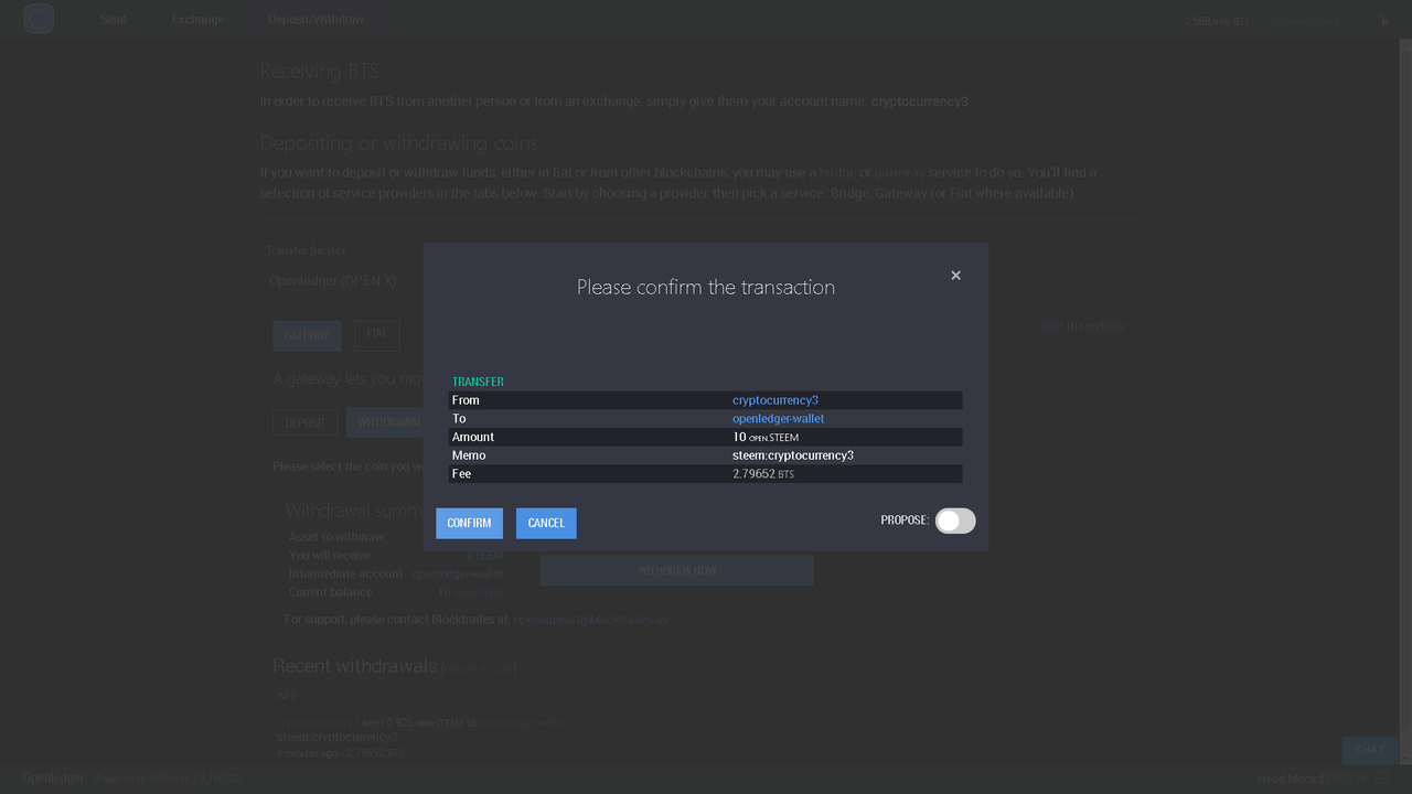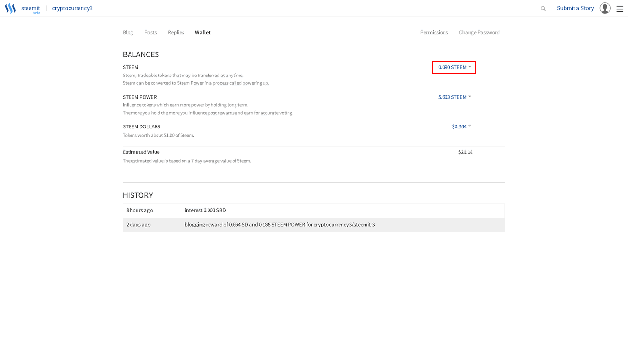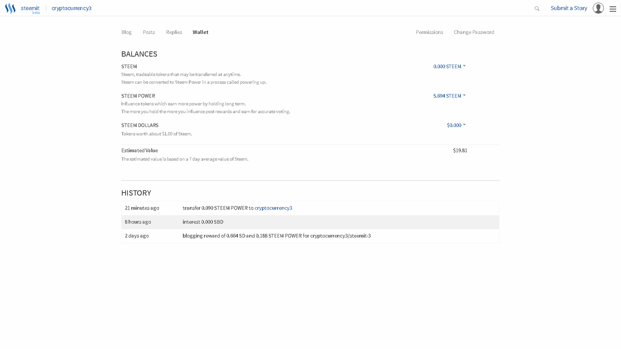 手続きが終わるとWalletの「STEEM POWER」に取引が反映され、HISTORYに履歴が残ります。