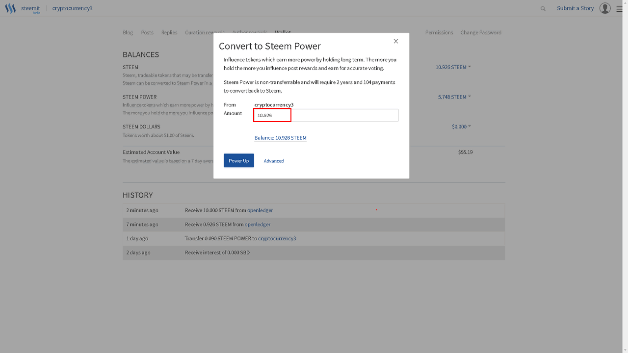 今度はSteemitのWalletの「Power Up」機能で、手に入れたSTEEMをSPに変更します。STEEMとSPは等価で交換され、両替にあたっての制限はありません。(逆のSP→STEEMの場合は制限あり)