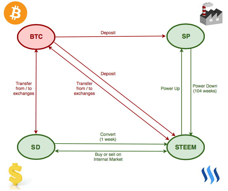 SPは長期保有者にメリットを与え、貯蓄量に応じて投票権が与えられ、キュレーション活動を通じて他のスティーミアンのポスト報酬に影響を与えます。つまりこのSPこそが、最もサイトの品質やSTEEMの価値向上と関係性が高くなり、名前の通りSteemのコンテンツを創り出す工場のエネルギーの源になっています。SPは内部留保されやすく、インフレ通貨であるSTEEMの価格下落抑制作用として機能します。