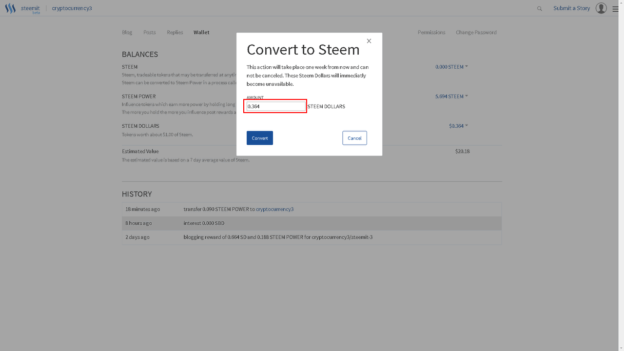 「Convert to STEEM」をクリックすると以下の画面が表示されますので、交換希望金額を「Amount」に入力し「Convet」ボタンを押します。