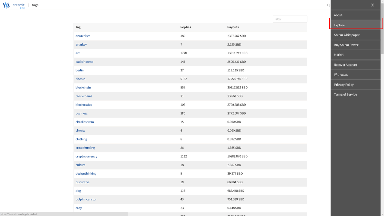 つまり、この「投稿」と「投票」による2つの繊細な仕組みにより、あなたの「Curators(キュレター)」としての優れた投稿は「Upvote(アップボート)」によって評価され、逆の場合は「Dounvote(ダウンボート)」によって報酬を失います。さらに不人気な投稿は、検索機能を果たすトップページのプルダウンメニューにある「tranding」の「hot」や「active」からリストとして外されるようです。