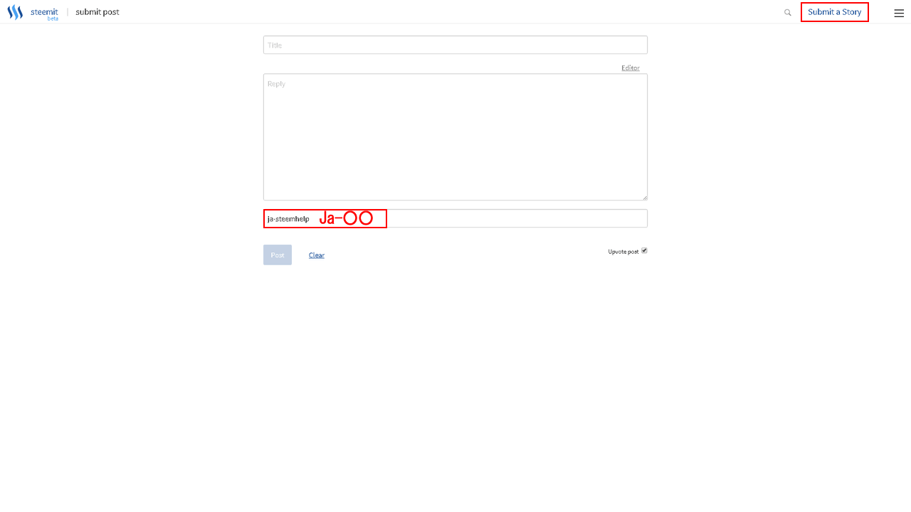 まずは、「https://steemit.com/」にアクセスしログインします。その後、画面右上の「Submit a Story」をクリックすると以下の画面が表示されますので、通常のブログと同じようにタイトルを決め記事を書きます。書き終わり次第、日本語で投稿する場合は「Tag(Tage)」スペースに「ja‐(トピックス名)」を入力し、最後に「Post」ボタンを押し投稿します。