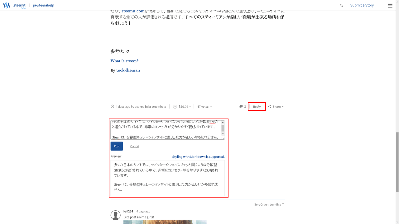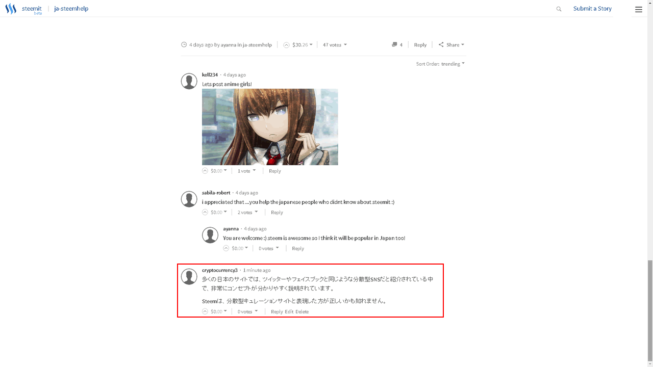 次に他のユーザーが投稿したコンテンツに対して、関連性の高いコメントを補足する事によって報酬を狙います。他のユーザーから価値がある投稿として認められた場合に限り、報酬につながる「Upvote」を獲得する事が出来ます。