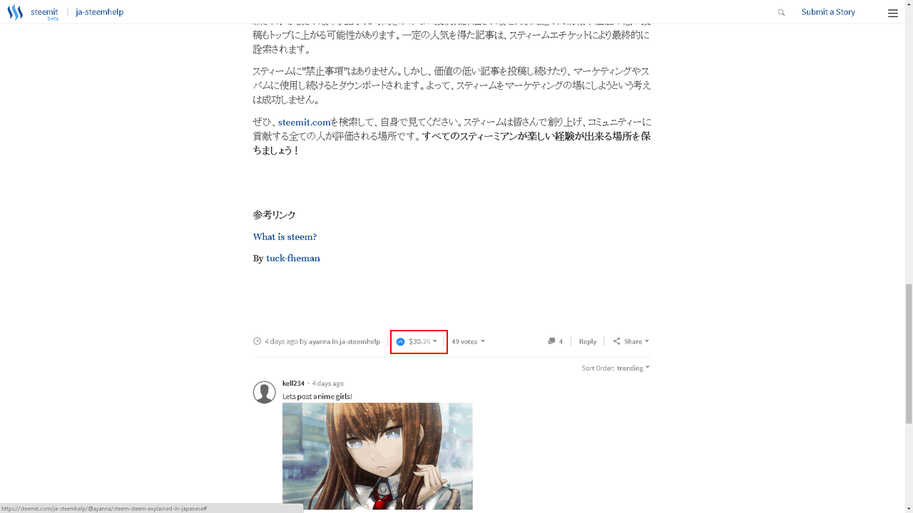 他のユーザーが投稿したコンテンツやコメントに投票を行います。報酬は投稿対象の人気度だけでなく、投稿から経過した時間も関わっており、人より早く投票した方が有利に働きます。あなたは価値があると思った投稿を見つけ次第、赤枠の「Upvote」をクリックする事で投票が行えます。