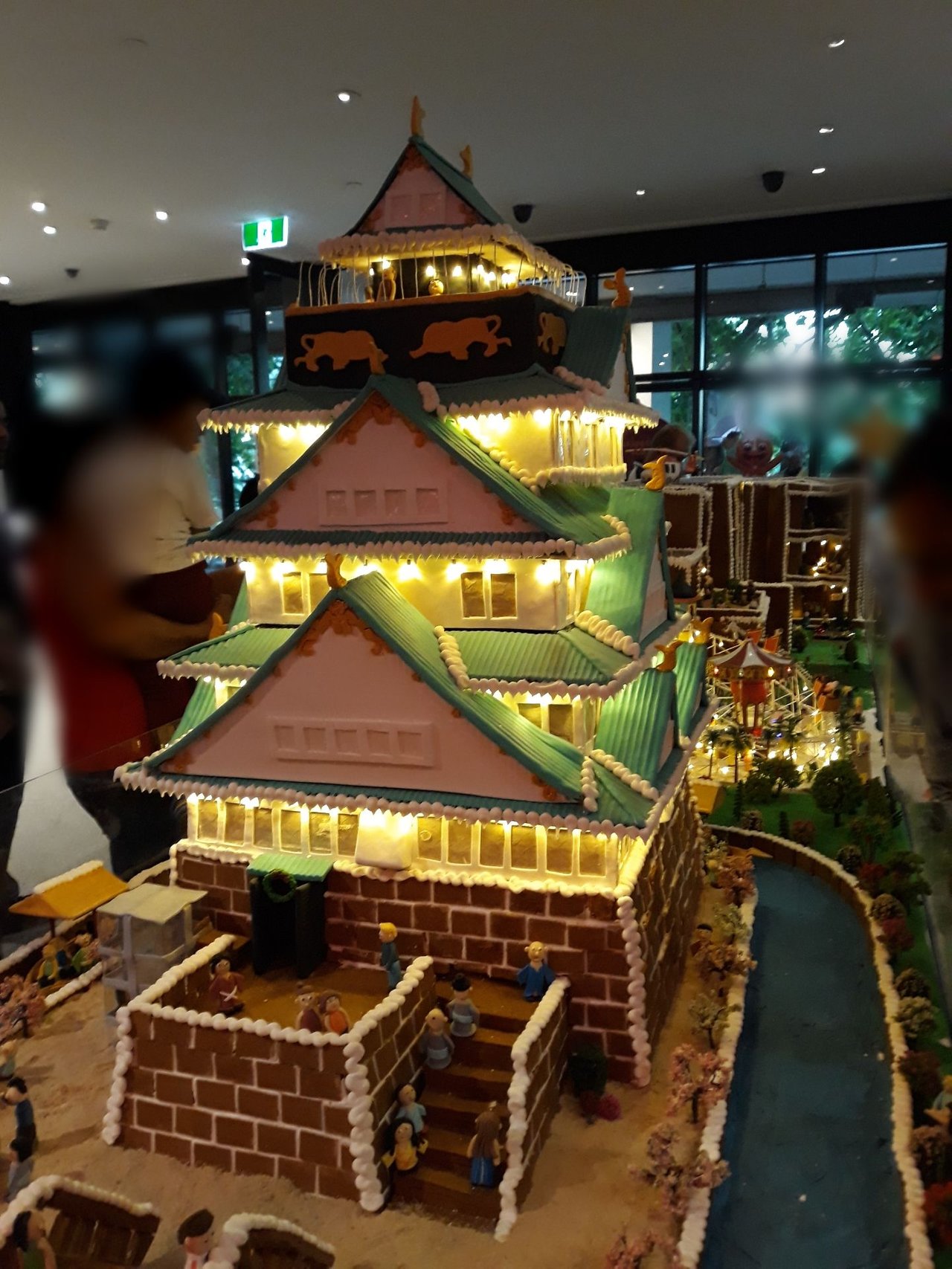 大阪城のお堀はジンジャーブレッド (クッキー )で作られていて、屋根や天守閣はアイシングで作られています。この展示品はすべて食べられるんですよ。