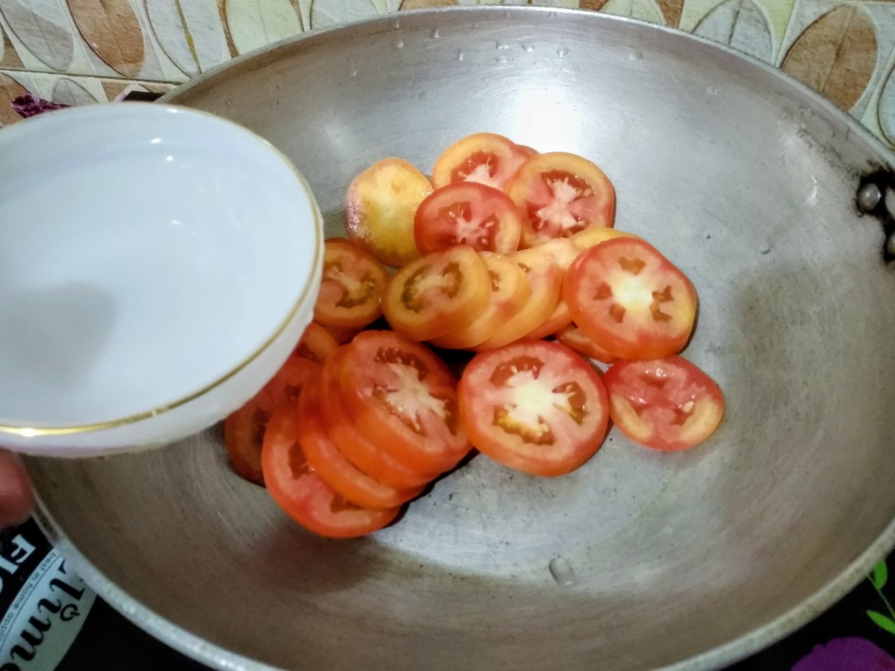 Then I put a pan on the stove and add the chopped tomatoes in the pan. I add a cup of water and cover with a lid to cook the tomatoes.