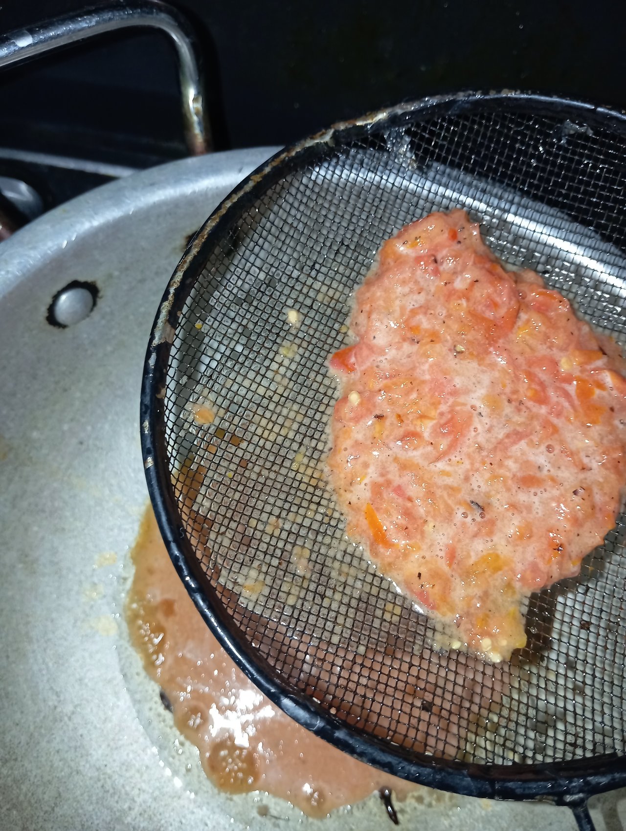 Then I added tomato pulp and cooked it for a while then added all ingredients such as salt, red chilli ,black pepper, jaggery and cooked it until done. Now I turned off flame added chopped basil leaves and kept at flame. Then I stain and removed the extra things. It was ready to serve.