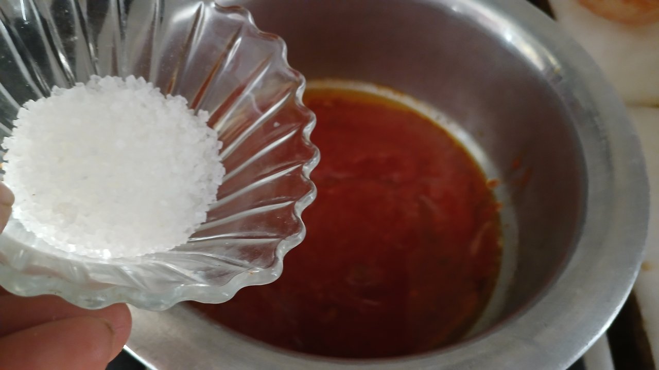 • Now, add tomato paste in it and add salt, sugar and apple cider vinegar and cook the mixture to desire consistency.