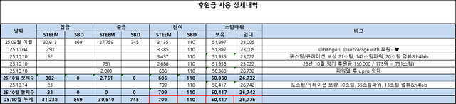 [kissteemkr] 25년 10월 둘째주 재정 보고💕steemCreated with Sketch.kissteemkr (73)adminin KissteemKR • 12 hours ago 안녕하세요. 사랑을 나누는 키스팀입니다. 10월 둘째주 재정 보고입니다~! 이번주 포스팅, 큐레이션 보상은 약 10스팀, 35스팀파워, 그리고 업뷰 외 보상이 13스팀입니다. 연휴 동안 포스팅을 몇 번 빼먹어서 죄송합니다. ^^;; 이번 주는 특별한 이벤트가 없습니다. 앞으로 빠짐없이 포스팅하면서 재정 확보를 하겠습니다. 오늘도 행복하세요. 감사합니다. 사랑합니다. 축복합니다. ❤️❤️❤️ #kissteemkr #krsuccess #love #donation