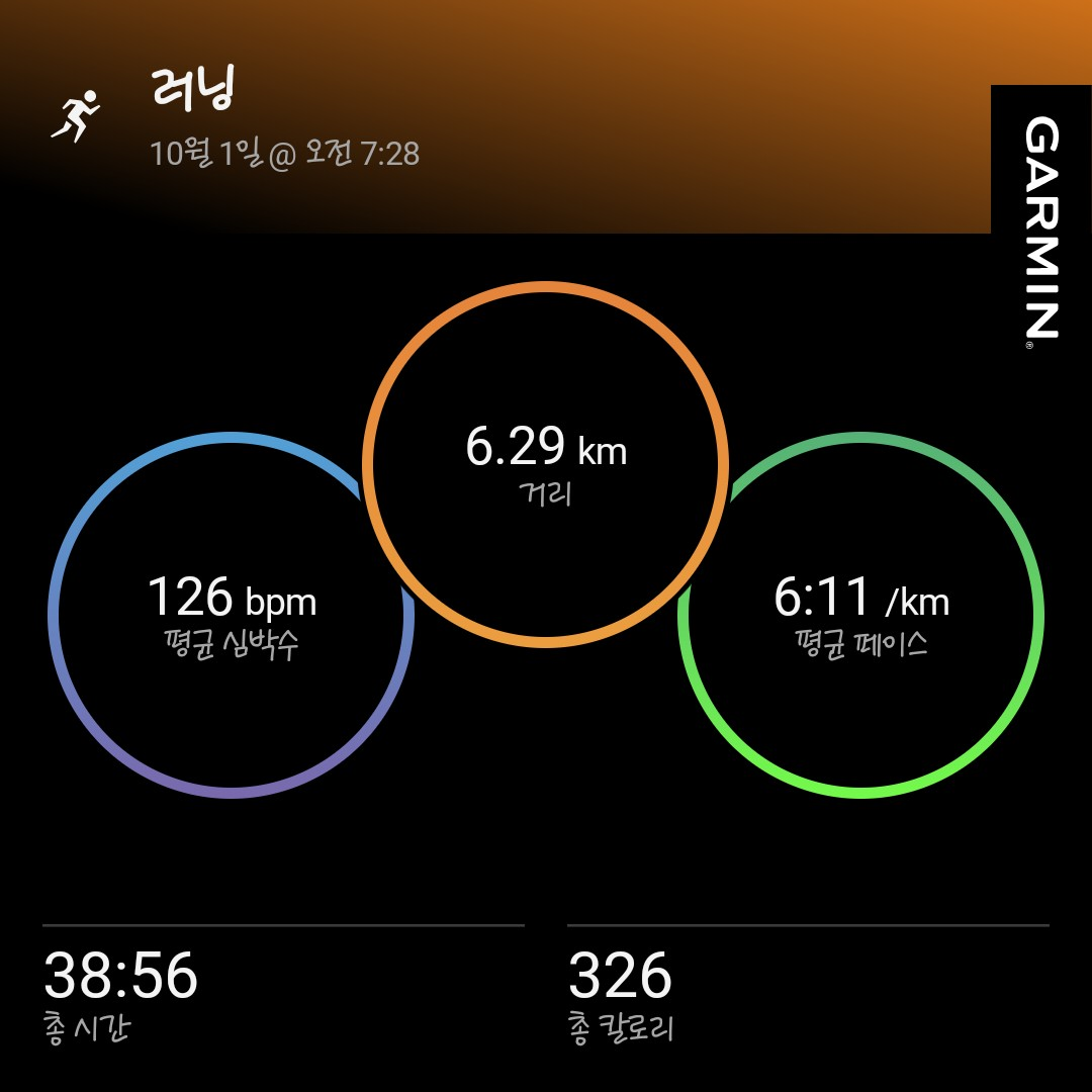10월 300km 완주 챌린지_오늘운동완료 6km(목표6km)steemCreated with Sketch.hirue (77)modin Korea M2E • 8 hours ago 10월의 첫날입니다. 금요일 하프 마라톤은 신청해놔서 오늘은 몸풀기로 조금 달렸습니다. 20251001(수) 6km #stepn-kr #m2e #superwalk #garmin #nike #running