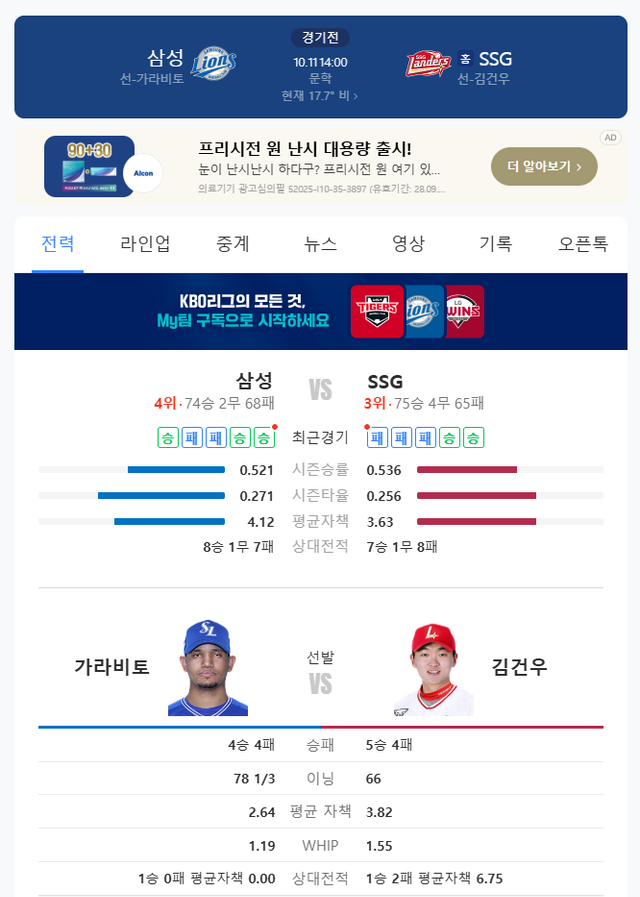 선발이 펑크가 난 SSG가 어떤 모습을 보여줄지 관건 이네요.