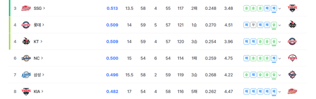 3위 SSG부터 8위 기아 까지 3.5 게임 차이입니다.