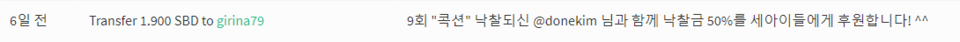 - 9회차 콕션 @donekim 님 낙찰되셔서 1.9 SBD 기부완료!