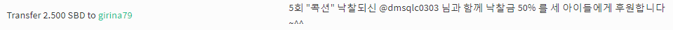 - 5회차 콕션 @dmsqlc0303 님 낙찰되셔서 2.5 SBD 기부완료!