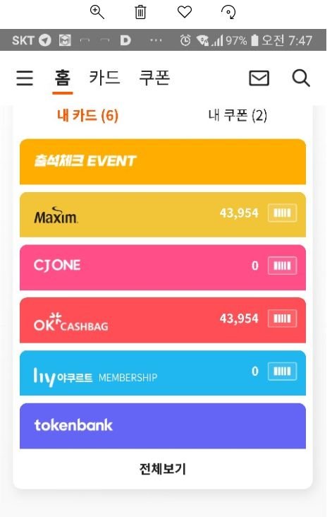 홈버튼 옆을 클릭하면 카드관리를 통해 아래와 같이 토큰뱅크 지갑을 추가할수 있습니다.