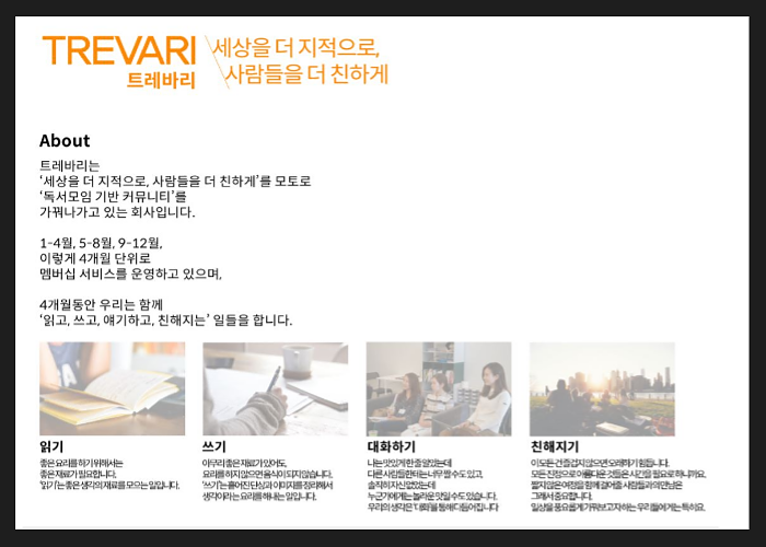 제가 친구와의 대화에서 이야기한 트레바리는 워낙 유명해서 많은 분들이 아실거예요. 독서모임 기반 커뮤니티인데 모토가 '세상을 더 지적으로, 사람들을 더 친하게' 예요.