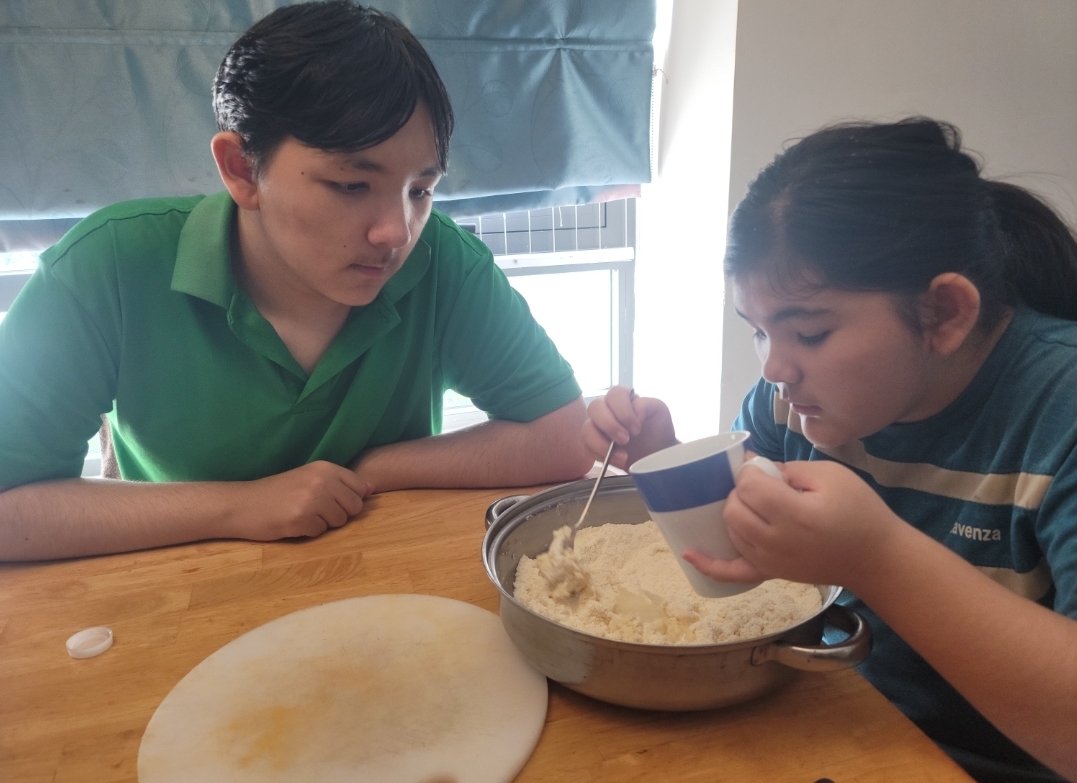 The kids wanted to make pancakes for breakfast this morning, and so, I prepared the materials and they made it.