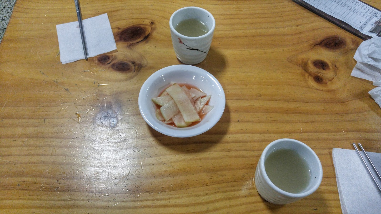 반찬은 아주 단촐합니다. 냉면무와 메밀을 끓인 물... 딱 2가지 있습니다.