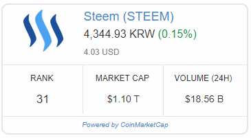 [20180504-스팀분석/Steem Analysis] 스팀의 현재 시세 / Price of Steemtravelkorea (53)in #kr • 7 years ago 스팀이 꾸준히 상승하고 있습니다. 천천히 다지면서 올라가는 모습이라. 좋네요. 다만, 랭크를 보면 여전히 30~31위를 머물고 있습니다. 이 말인 즉슨... 스팀 자체의 성장이라기 보다 비트코인의 성장으로 인한 결과로 보입니다. Steem going up. #jjangjjangman #steemit #bitcoin #blog