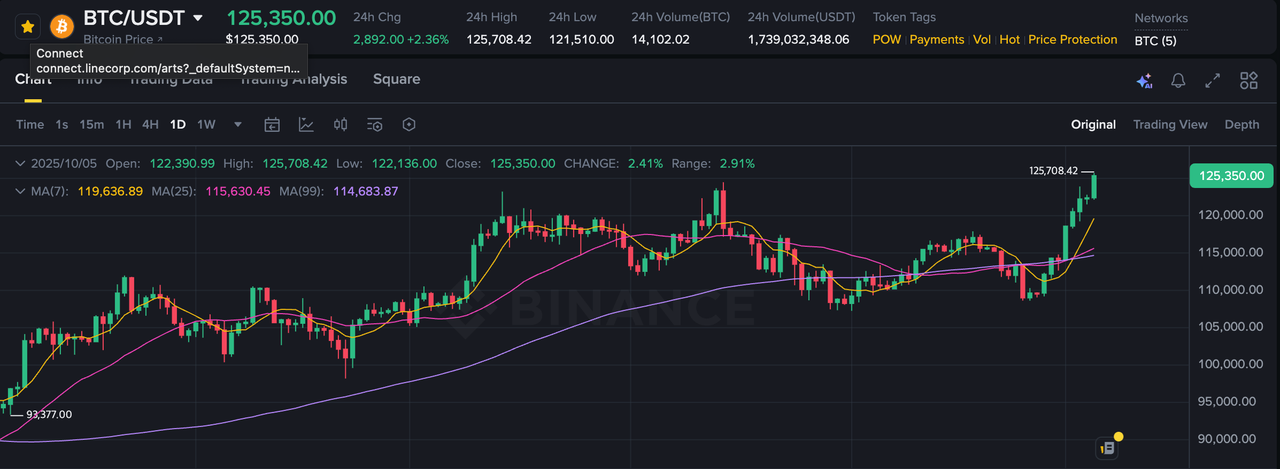 | kfeedgamer5 [Posts] 오후 5:08:12 BTC/USD: Bitcoin Jumps to Record $125,000 Despite Govt Shutdown. Welcome, Uptober. |