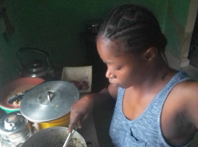 In the evening I started prepping what I will cook for the family because my husband will come back. I prepared vegetable leaf; I did it the way my husband does it. The ingredients were already in the house.