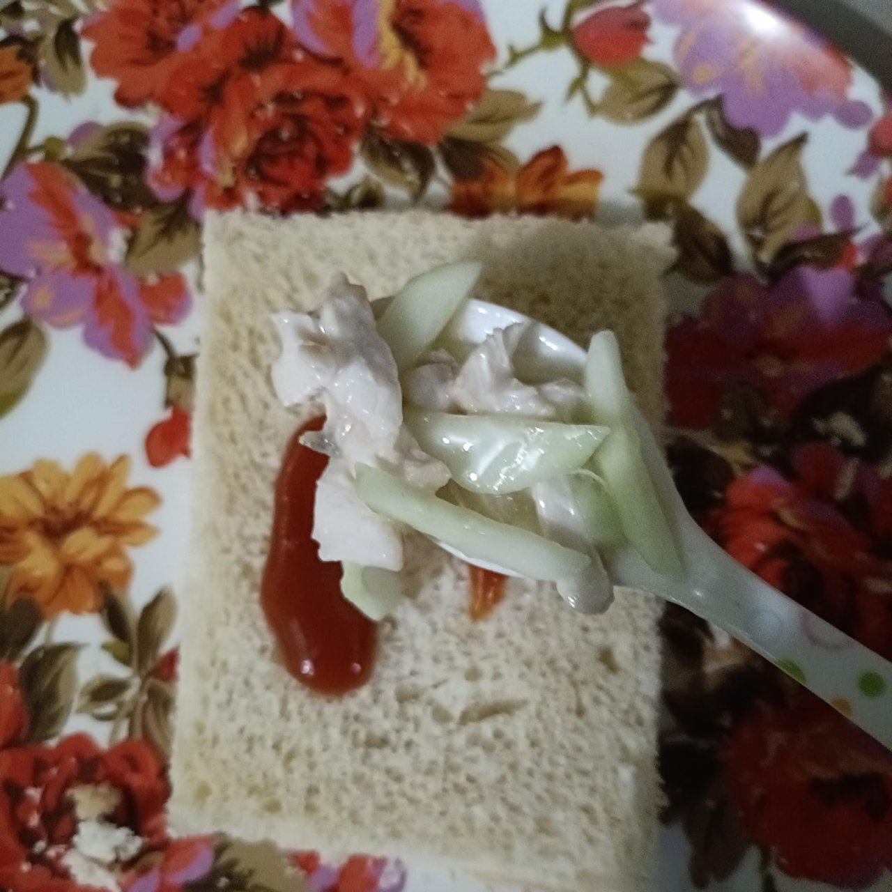 Along with that, I will serve my finger food by putting some cucumbers in front of it. Then I will take a picture and I'll take a picture with my name tag on it, and that's how the delicious sandwich I made today will be ready.