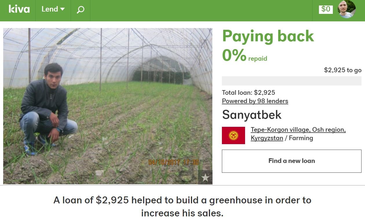 As I was sitting on the train to the airport before flying to SteemFest2 in Lisbon last Wednesday, I realised I hadn’t made my regular monthly loan on Kiva.org. I try to lend once a month, usually on the 17th or the 18th of each month. I got my smartphone and browsed through the currently funraising loans. After a little bit of exploring I settled on a loan to Sanyatbek, a young man of 22 years in Kyrgyzstan, a farmer who owns his own farm. On his 0.45 hectares / 0.11 acres of land he’s cultivating garlic for sale on the local markets. The farming is profitable as it is, but Sanyatbek has bigger dreams and he needed a loan to build another greenhouse to grow organic vegetables.