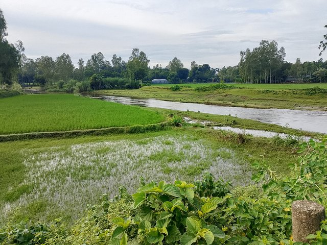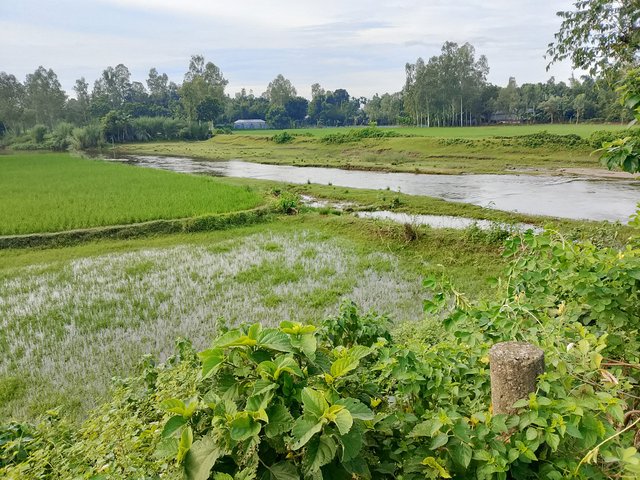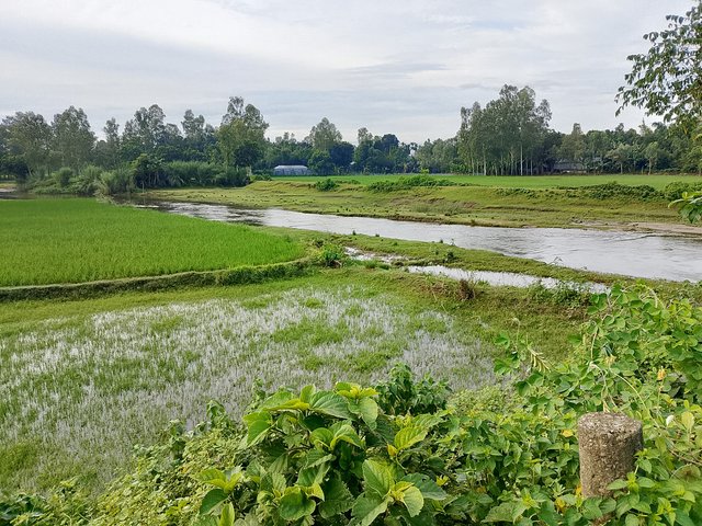 A small river is flowing, and beside it, there are paddy fields. The river here has a certain shape, and water is slowly flowing through it. The water of this river is moving very beautifully. This place was a scenic and pleasant environment. Such places are very pleasing to us.