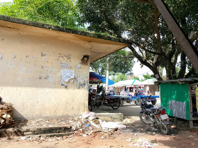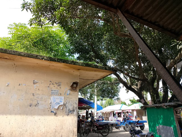 In a big market scene, there are trees around and shops as well, and many auto-rickshaws can be seen standing there. I went to the market at noon, and for that reason, there were fewer people and fewer vehicles. Because of this, we could see the trees and various things there.