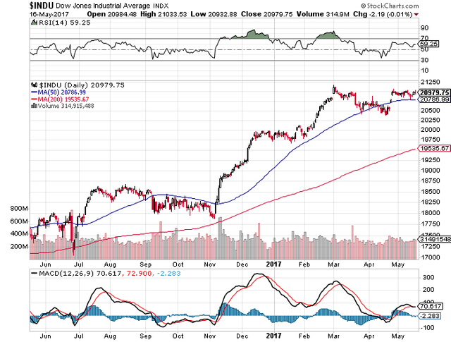 The Comey scandal, the North Korean uncertainty, the ugly numbers coming out of retail brick & mortar, combined with the deteriorating technical indicators on the DOW, lead me to conclude the Trump stock market rally from the past several months is now over ... be on the lookout for a correction phase starting very soon, IMO.