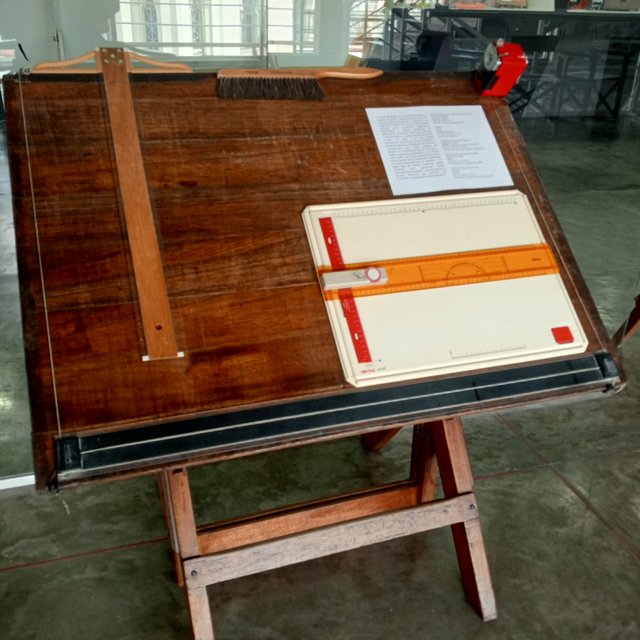 Antigua mesa e implementos de trabajo, como regla T, escuadras, sacapuntas eléctrico