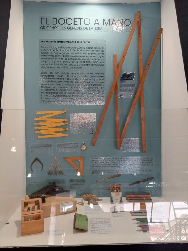 En una primera área están expuestos material de trabajo de dibujo, proyectos muy conceptuales y diversidad de textos especializados en arquitectura y urbanismo, así como libros de cronistas y fotógrafos.