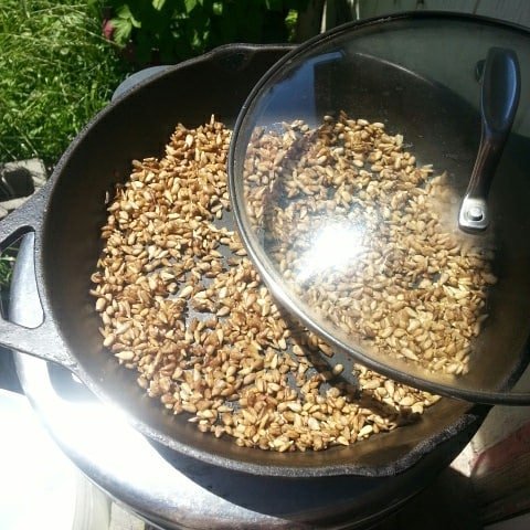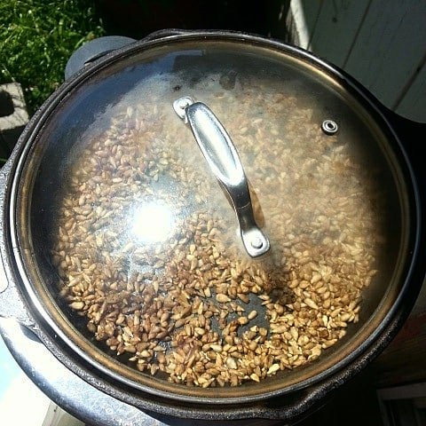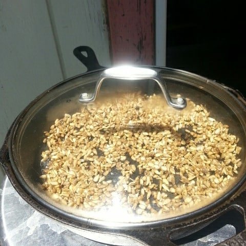 It is blazing saddles here in Eugene almost 100 degrees... I had a jar of soaked organic raw sunflower seeds and had an idea.....🌻🌻🌻🌿🌱🌿🌻🌻🌻 I mixed 1 tsp sea salt with seeds, spread out in cast iron pan with a glass lid. I placed it in direct sunlight. About 20 minutes later I opened the lid to let some moisture out. Several hours later, they turned out perfect and tasty. Better than stove top roasted by far. Solar energy cooked/warmed food has a life force taste different than food cooked by stove or microwave. You might need a handle cover if you try at home... the pan gets hot!
