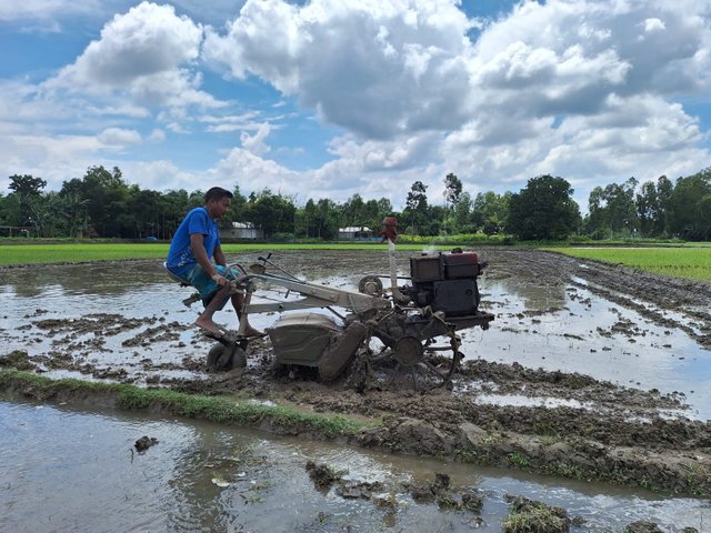 We use a power tiller for land cultivation. We are cultivating the land after watering it with a machine. Rice seedlings will be planted in the prepared land by making a good mud. However, the land is not cultivated in one day. After cultivating this land for the first two days or more, rest is given to the grass in the land to rot.